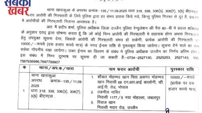 मध्य प्रदेश के उज्जैन से बड़ी खबर सामने आई है। यहां धोखाधड़ी के मामले में लंबे समय से फरार चल रहे भाजपा नेता पर पुलिस विभाग ने 10 हजार का...