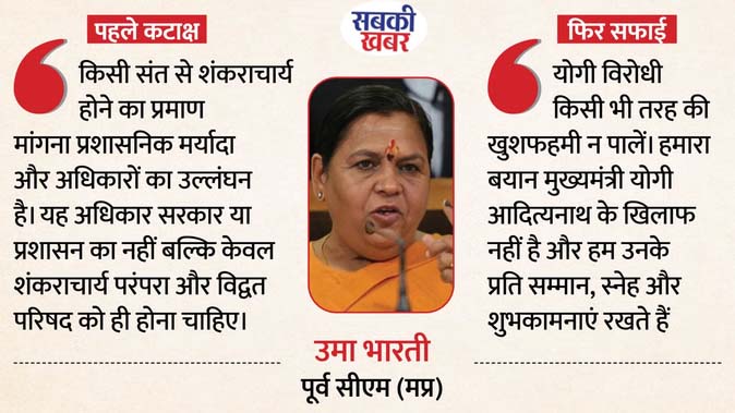 विवाद बढ़ने के बाद उमा भारती ने दूसरा ट्वीट कर अपना रुख स्पष्ट किया। उन्होंने साफ कहा कि योगी विरोधी किसी भी तरह की खुशफहमी न पालें। उनका बयान मुख्यमंत्री योगी आदित्यनाथ के खिलाफ नहीं है और वे उनके प्रति सम्मान, स्नेह और शुभकामनाएं रखती हैं। हालांकि, सफाई के बावजूद उमा भारती अपने मूल स्टैंड पर कायम रहीं। उन्होंने दोहराया कि प्रशासन को कानून-व्यवस्था पर सख्ती से नियंत्रण रखना चाहिए, लेकिन किसी के शंकराचार्य होने का सबूत मांगना मर्यादा का उल्लंघन है और यह अधिकार सिर्फ शंकराचार्य परंपरा या विद्वत परिषद को ही होना चाहिए।