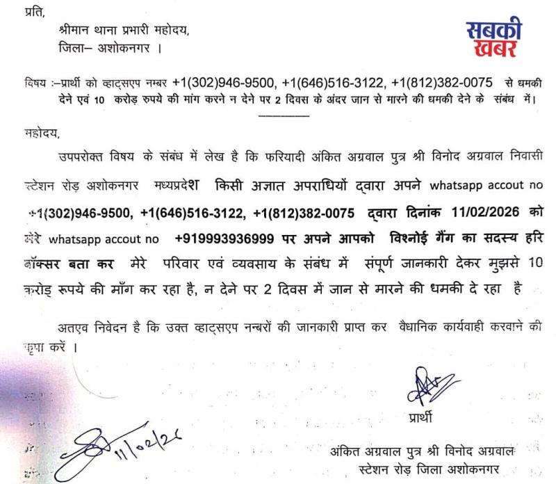 मध्य प्रदेश के अशोकनगर जिले में प्रतिष्ठित व्यवसाई अंकित अग्रवाल को लॉरेंस बिश्नोई गैंग से धमकी मिली है. जिसकी शिकायत का आवेदन उद्योगपति द्वारा कोतवाली में दिया गया है.