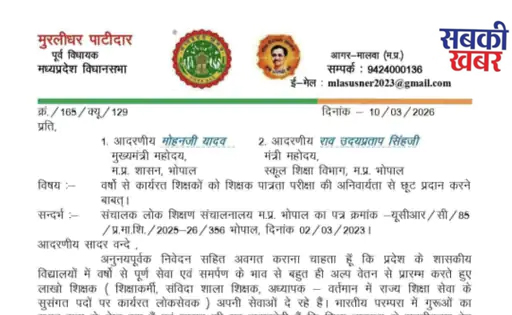 सुसनेर से भाजपा के पूर्व विधायक मुरलीधर पाटीदार ने मुख्यमंत्री डॉ. मोहन यादव और स्कूल शिक्षा मंत्री उदय प्रताप सिंह को लिखे पत्र में कहा है कि प्रदेश के शासकीय विद्यालयों में वर्षों से समर्पण भाव से अल्प वेतन पर शिक्षा दे रहे लाखों शिक्षक, जो शिक्षाकर्मी और संविदा शाला शिक्षक के रूप में नियुक्त हुए थे, शिक्षा व्यवस्था को सुदृढ़ करने में महत्वपूर्ण भूमिका निभा रहे हैं। उन्होंने कहा कि आयुक्त लोक शिक्षण कार्यालय से जारी पत्र के बाद प्रदेश का समग्र शिक्षक समाज हतप्रभ है कि इतने लंबे अनुभव और कार्यसिद्धि के बाद भी उन्हें शासकीय सेवा में स्वयं को फिर से साबित करना होगा। इस आदेश से भ्रम और व्यापक असंतोष की स्थिति बनी है। इससे शिक्षक समाज चिंतित और असुरक्षित महसूस कर रहा है तथा आंदोलन की ओर अग्रसर हो रहा है। पाटीदार ने मुख्यमंत्री और स्कूल शिक्षा मंत्री से आग्रह किया है कि इस मामले में संज्ञान लेते हुए संबंधित निर्देश को निरस्त किया जाए। साथ ही सर्वोच्च न्यायालय के निर्देश और शिक्षा का अधिकार अधिनियम को ध्यान में रखते हुए शासन स्तर पर सकारात्मक पहल कर ऐसा मार्ग निकाला जाए, जिससे शिक्षा का अधिकार अधिनियम लागू होने से पहले नियुक्त शिक्षकों को किसी प्रकार की अपमानजनक प्रक्रिया से न गुजरना पड़े। आवश्यकता हो तो शिक्षा का अधिकार अधिनियम में संशोधन भी किया जाए। उन्होंने चेतावनी दी कि यदि इस मामले में शीघ्र सकारात्मक कार्रवाई नहीं की गई, तो शिक्षक समाज उग्र आंदोलन की ओर बढ़ेगा और वे स्वयं भी उनके आंदोलन का समर्थन करेंगे।