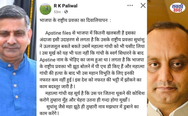 सुधांशु त्रिवेदी के इस बयान पर मध्य प्रदेश और छत्तीसगढ़ के पूर्व प्रिंसिपल चीफ इनकम टैक्स कमिश्नर आर.के. पालीवाल ने फेसबुक पर अपनी कड़ी नाराजगी व्यक्त की है। अपनी ईमानदारी के लिए चर्चित रहे पूर्व IRS अधिकारी पालीवाल ने त्रिवेदी की बौद्धिक क्षमता पर सवाल उठाते हुए उन्हें 'मूर्ख' और 'मानसिक रूप से दिवालिया' तक कह डाला।