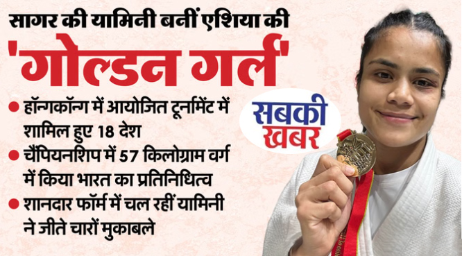 चाइना के हॉन्गकॉन्ग में आयोजित एशियन जूडो चैंपियनशिप में सागर की होनहार जूडो खिलाड़ी यामिनी मौर्य ने शानदार प्रदर्शन करते हुए स्वर्ण पदक अपने नाम किया है। यामिनी की इस उपलब्धि से न सिर्फ मध्यप्रदेश, बल्कि पूरे देश का मान अंतरराष्ट्रीय मंच पर एक बार फिर बढ़ गया है। जानकारी के अनुसार इस प्रतिष्ठित टूर्नामेंट में कुल 18 देशों ने हिस्सा लिया था। यामिनी ने शानदार फॉर्म दिखाते हुए अपने चारों मुकाबले जीते। फाइनल में उन्होंने कड़े मुकाबले में कोरिया की खिलाड़ी को हराकर गोल्ड मेडल हासिल किया। हॉन्गकॉन्ग में आयोजित इस एशियन चैंपियनशिप में यामिनी मौर्य 57 किलोग्राम वर्ग में भारत का प्रतिनिधित्व कर रही थीं। दमदार प्रदर्शन करते हुए उन्होंने अपने शानदार खेल के दम पर स्वर्ण पदक देश की झोली में डाला। यामिनी की इस उपलब्धि से सागर जिले में खुशी का माहौल है। खेल जगत के साथ-साथ जिलेवासियों ने भी उनकी सफलता पर गर्व जताते हुए उज्ज्वल भविष्य की शुभकामनाएं दी हैं। सागर के सदर क्षेत्र की रहने वाली यामिनी ने अपनी स्कूली शिक्षा इमानुएल स्कूल से की है। उन्होंने डॉक्टर हरिसिंह गौर केंद्रीय विश्व विद्यालय से ग्रेजुएशन किया है। यामिनी के पिता हरिओम मौर्य एक छोटे किसान हैं। बेटी की इस उपलब्धि पर पूरे परिवार में खुशी का आलम है।