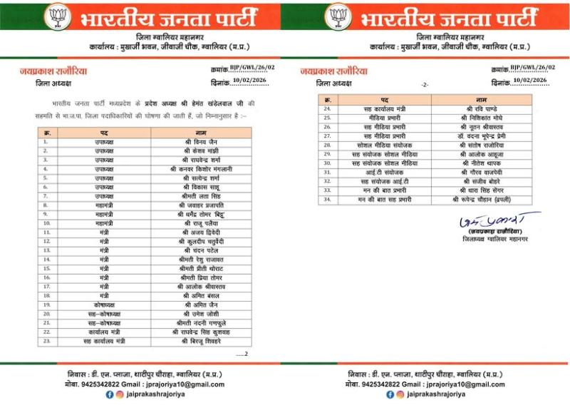 मध्य प्रदेश भाजपा अध्यक्ष हेमंत खंडेलवाल की सहमति से भारतीय जनता पार्टी ग्वालियर महानगर जिले के नए पदाधिकारियों की घोषणा कर दी गई है। इस सूची में कुल 34 नेताओं को संगठनात्मक जिम्मेदारी सौंपी गई है। भाजपा संगठन द्वारा जारी सूची के अनुसार, महानगर स्तर पर संगठन को मजबूत करने, आगामी चुनावी तैयारियों और पार्टी की नीतियों को जन-जन तक पहुंचाने के उद्देश्य से यह नियुक्तियां की गई हैं। नए पदाधिकारियों में संगठनात्मक अनुभव, सक्रिय कार्यकर्ताओं और युवा नेतृत्व को प्राथमिकता दी गई है। पार्टी सूत्रों के अनुसार, इन नियुक्तियों से ग्वालियर महानगर में संगठनात्मक गतिविधियों को नई गति मिलेगी और बूथ स्तर तक पार्टी की पकड़ और मजबूत होगी। सभी नवनियुक्त पदाधिकारियों से अपेक्षा की गई है कि वे संगठन हित में समर्पित भाव से कार्य करते हुए भाजपा की विचारधारा को आगे बढ़ाएंगे। भाजपा नेतृत्व ने सभी नवनियुक्त पदाधिकारियों को शुभकामनाएं देते हुए संगठन के प्रति जिम्मेदारी और अनुशासन के साथ कार्य करने का आह्वान किया है।