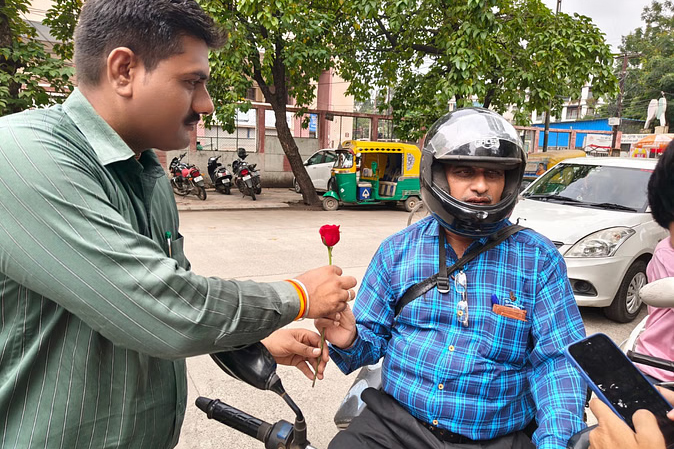 इंदौर में नया नवाचार... हेलमेट पहन कर आने वाले सरकारी कर्मचारियों का गुलाब देकर स्वागत