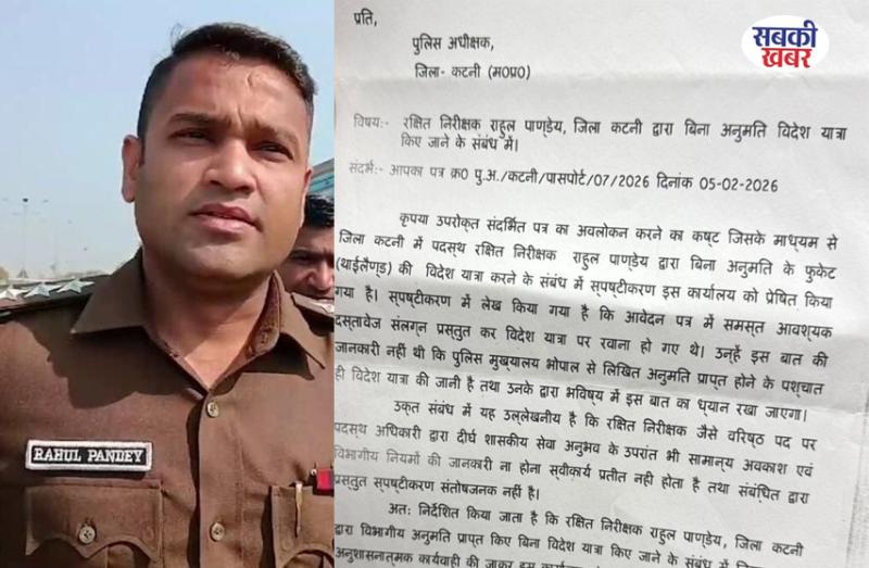 मध्य प्रदेश पुलिस के एक जिम्मेदार अधिकारी को बिना विभागीय अनुमति के विदेश यात्रा करना अब महंगा पड़ने वाला है। कटनी जिले में पदस्थ रक्षित निरीक्षक (RI) राहुल पांडे द्वारा नियमों को ताक पर रखकर थाईलैंड (फुकेट) की सैर करने के मामले में पुलिस मुख्यालय (PHQ) ने सख्त रुख अपनाया है। स्पेशल डीजी (प्रशासन) ने कटनी एसपी को आरआई के खिलाफ कड़ी अनुशासनात्मक कार्रवाई करने के निर्देश दिए हैं।