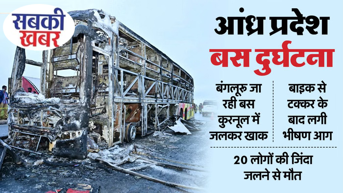 आंध्र प्रदेश के कुरनूल जिले के चिन्नातेकुर के निकट एक निजी बस में दोपहिया वाहन से टक्कर के बाद आग लग गई, जिससे इस हादसे में 20 लोगों की मौत हो गई। पुलिस ने बताया कि मरने वालों में बाइक सवार एक व्यक्ति भी शामिल है। हादसे पर पीएम मोदी और राष्ट्रपति द्रौपदी मुर्मू ने शोक जताया है। प्रारंभिक सूचना के अनुसार, बंगलूरू से हैदराबाद जा रही बस में हादसे के दौरान करीब 41 लोग सवार थे। इसमें कहा गया है कि टक्कर के बाद मोटरसाइकिल बस के नीचे आ गयी और इसके ईंधन टैंक का ढक्कन खुल गया जिससे आग लग गई। कुरनूल के जिला कलेक्टर डॉ ए सिरी ने न्यूज एजेंसी एएनआई को बताया, यह दुर्घटना सुबह 3 से 3:10 बजे के बीच हुई जब बस एक बाइक से टकरा गई, जिससे ईंधन रिसाव हुआ और आग लग गई। 41 यात्रियों में से 21 को सुरक्षित बचा लिया गया है। बाकी 20 में से 11 के शवों की अब तक पहचान हो पाई है। बाकी की पहचान के प्रयास जारी हैं। कुरनूल संभाग के पुलिस उप महानिरीक्षक कोया प्रवीण ने बताया, 19 यात्री, दो बच्चे और दो चालक इस दुर्घटना में बाल-बाल बच गए। पुलिस ने बताया कि शॉर्ट सर्किट के कारण बस का दरवाजा जाम हो गया और कुछ ही मिनटों में बस पूरी तरह जलकर खाक हो गई। राष्ट्रपति द्रौपदी मुर्मू ने शुक्रवार को आंध्र प्रदेश में एक बस में आग लगने के कारण लोगों की हुयी मौत पर शोक प्रकट किया और इस दुर्घटना को बेहद दुर्भाग्यपूर्ण करार दिया। राष्ट्रपति ने ‘एक्स’ पर एक पोस्ट में कहा, आंध्र प्रदेश के कुरनूल में एक दुखद बस अग्निकांड में हुई मौतों की खबर बेहद दुर्भाग्यपूर्ण है। मैं शोक संतप्त परिवार के सदस्यों के प्रति अपनी हार्दिक संवेदना व्यक्त करती हूं, और घायलों के शीघ्र स्वस्थ होने के लिये प्रार्थना करती हूं।
