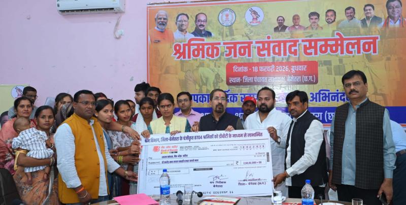 रायपुर : मुख्यमंत्री विष्णु देव साय के नेतृत्व में प्रदेश सरकार द्वारा श्रमिकों एवं उनके परिजनों की बेहतरी के लिए अनेक योजनाएं संचालित की जा रही है। इन योजनाओं के माध्यम से श्रमिकों की सामाजिक एवं आर्थिक स्थिति को बेहतर बनाने के लिए लगातार आर्थिक मदद दी जा रही है। इसी सिलसिले में छत्तीसगढ़ श्रम कल्याण मंडल के अध्यक्ष योगेश दत्त मिश्रा के मुख्य आतिथ्य में आज जिला पंचायत बेमेतरा के सभाकक्ष में श्रमिक जनसंवाद सम्मेलन का आयोजन किया गया।